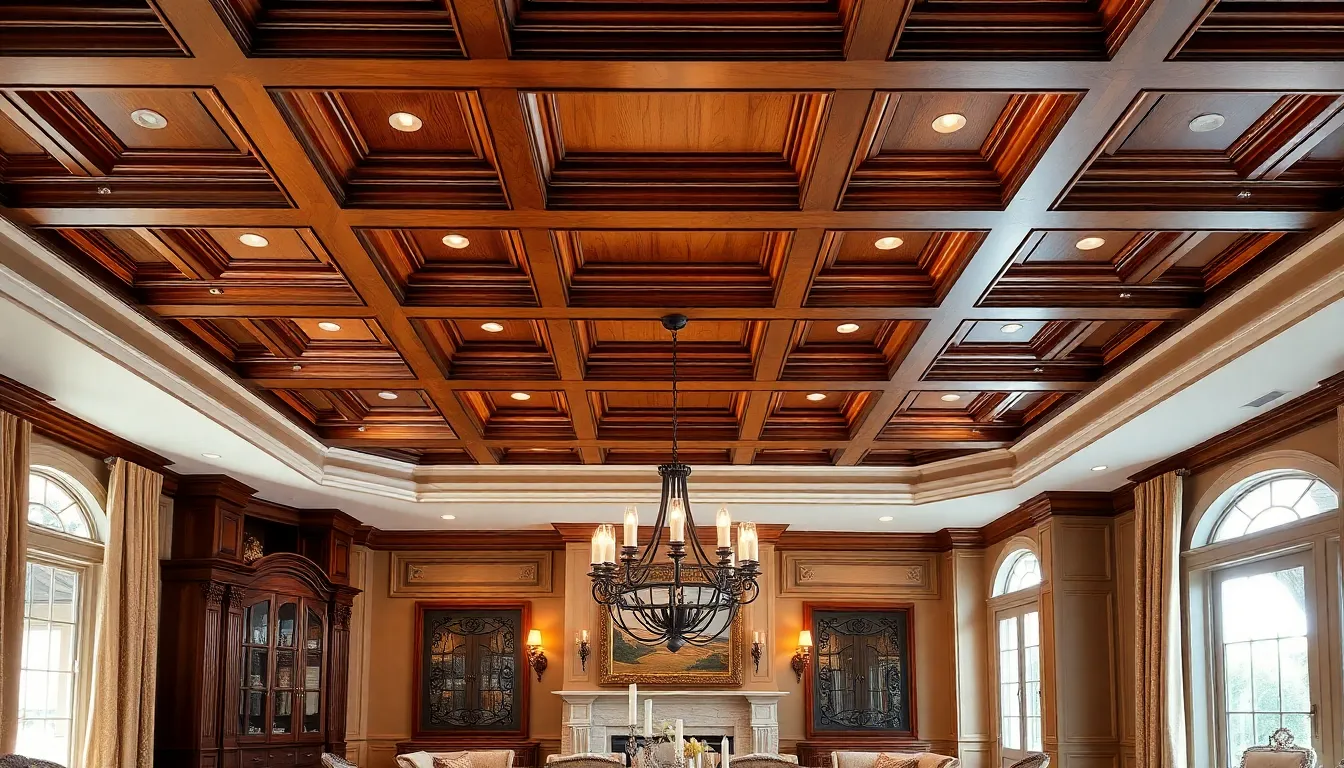 Coffered ceilings feature a grid pattern created by recessed panels. This classic design adds depth and dimension to any room. Often, wood beams or plaster moldings highlight the panels. Many homeowners appreciate the sophisticated look these ceilings provide. Spaces such as dining rooms or studies often benefit from coffered ceilings, enhancing the overall atmosphere with a luxurious touch.
